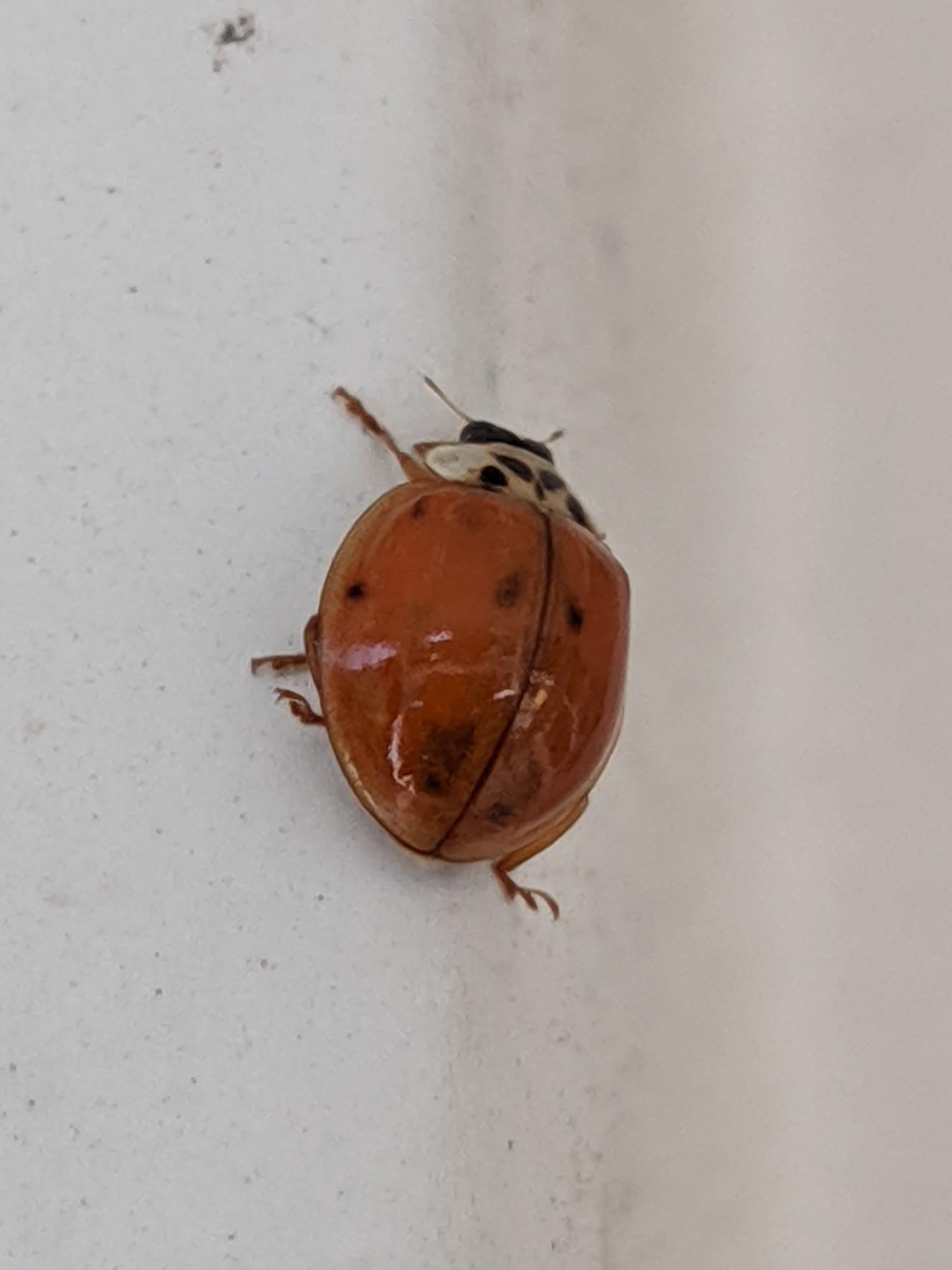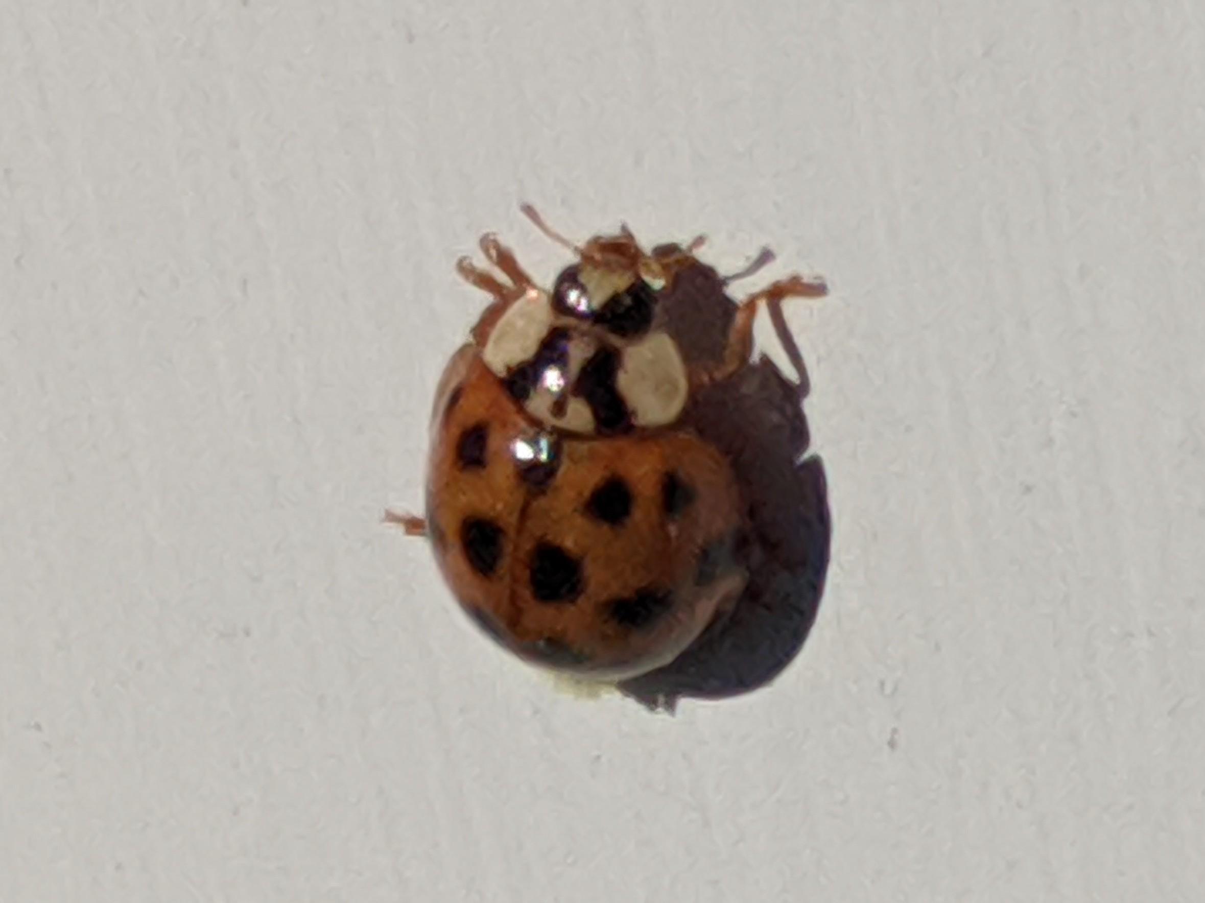 This ladybug is attempting to eat polyester fiber from a spider-web halloween decoration.